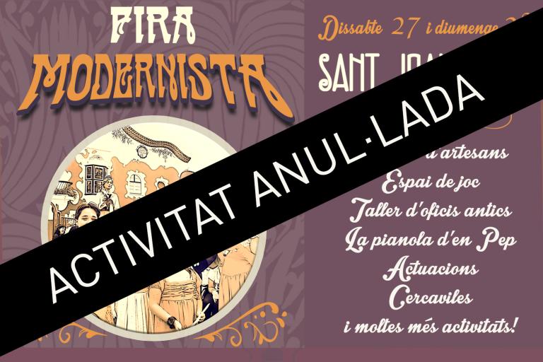 La celebració de la Fira Modernista, prevista per aquest cap de setmana, s'ha hagut d'anul·lar per la previsió de pluja durant dissabte 27 i diumenge 28. El cap de setmana modernista a Sant Joan Despí manté la resta d'activitats: el festival d'arquitectura 48h Open House Bcn, les Jornades Gastronòmiques i l'exposició 'La Generació de Jujol' al Centre Jujol-Can Negre.