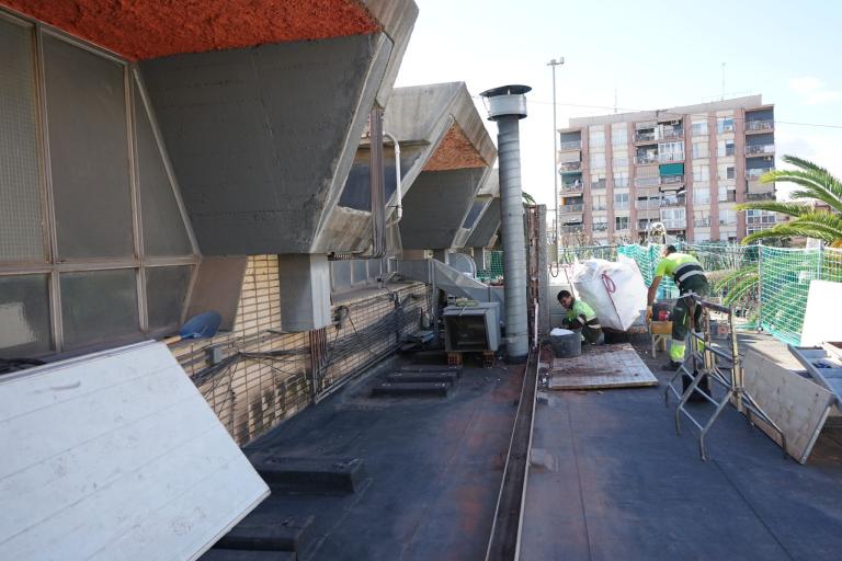L'eliminació de la maquinària i dels aparells d'instal·lacions ubicats als dos nivells de la coberta permetrà realitzar els treballs de millora d'impermeabilització, traslladant la maquinària al primer nivell de la coberta, a la façana posterior, on s'instal·larà un nou parament que farà una doble funció: de panell acústic alhora que de cartell publicitari.