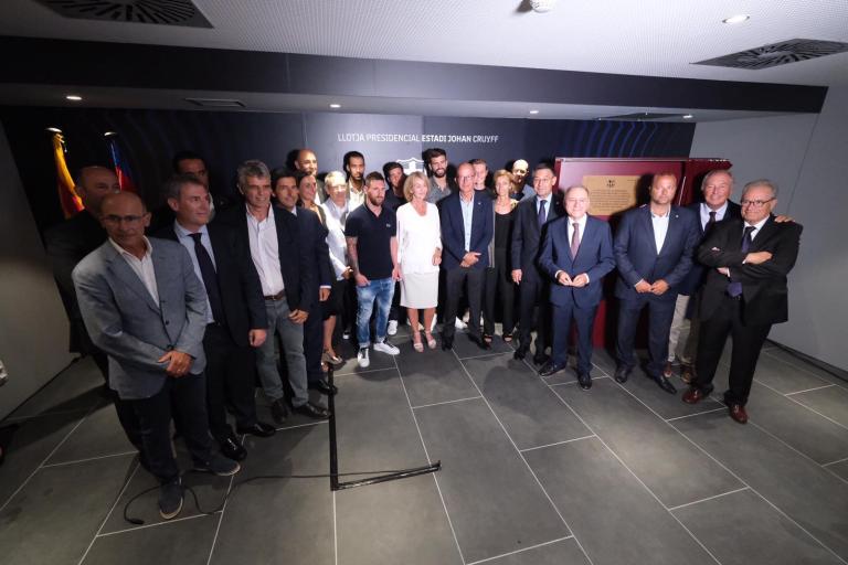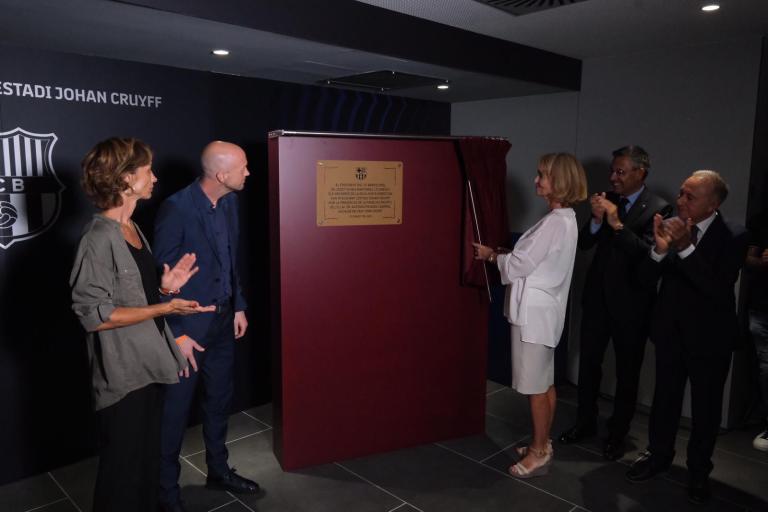 L'encarregada de descobrir la placa inaugural del nou estadi ha estat Danny Cruyff, esposa de Johan Cruyff, acompanyada pels seus fills Jordi i Suzila.