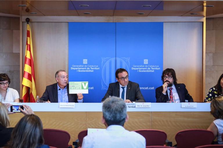 El consejero de Territorio y Sostenibilidad, Josep Rull; el vicepresidente de Transporte y Movilidad del Área Metropolitana de Barcelona, Antoni Poveda, la concejala de Movilidad del Ayuntamiento de Barcelona, Mercedes Vidal, y la directora del Servicio Catalán de Tráfico, Eugenia Doménech, han explicado esta mañana las medidas que se aplicarán cuando se declaren episodios de contaminación ambiental en nuestras ciudades a partir del 1 de diciembre.